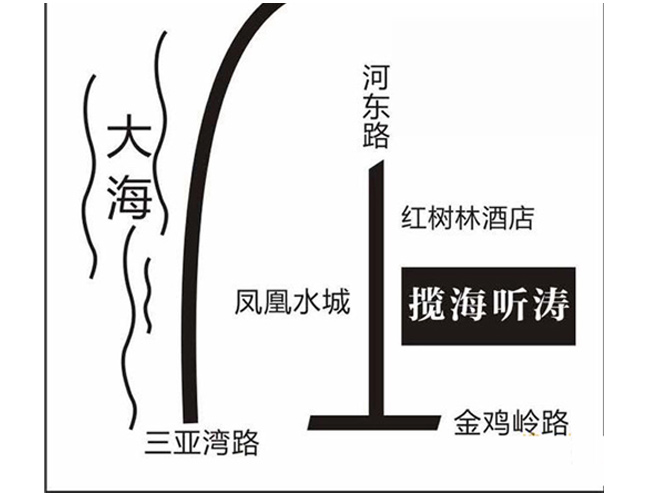 揽海听涛位于中国国际旅游岛、中国唯一的热带滨海城市三亚,占地面积20000平方米,规划总建筑面积40000平方米,周边分临凤凰路、金鸡岭路、解放路。三亚高端社区“凤凰水城”、有“东方拉斯维加斯”之称超五星级红树林酒店、金鸡岭公园、新行政中心紧邻本项目,充分享受背山、面海、临河的舒适生活,距离海边约800米,三亚湾17公里海域景观一览无遗。三亚河的支流由五指山流淌而来,在此处汇合成三亚河上游段区域,造就了原生态滨河景观,保存良好的红树林与成群出没的白鹭相映成辉,展现大自然的和谐氛围。