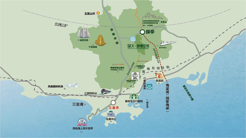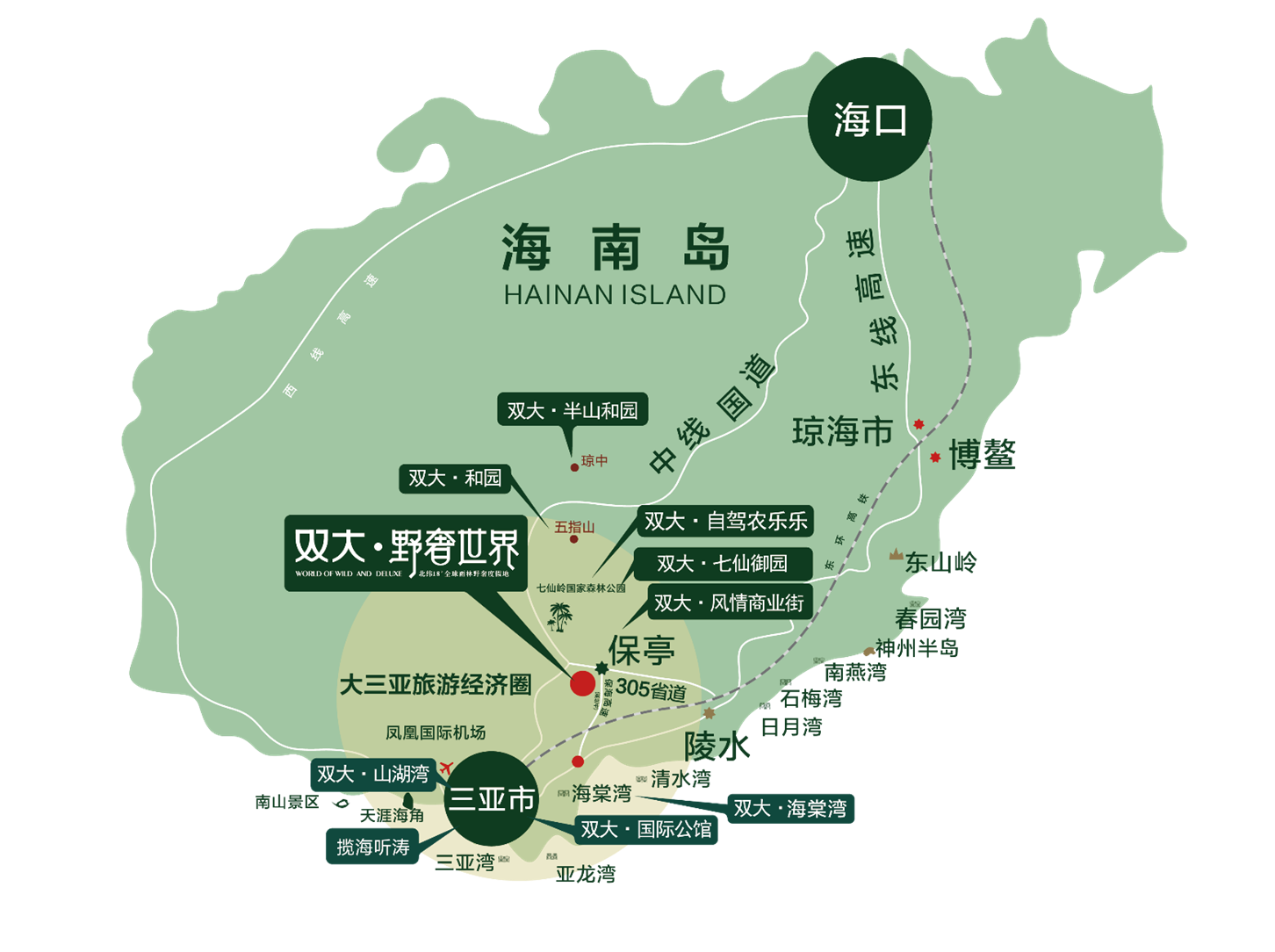保亭双大野奢世界项目位于保亭县城往西约3公里处,红兄水库旁,占地2000亩,包括320亩住宅建设用地,180亩酒店建设用地,1500亩休闲公园用地。项目深入研究黎族先祖在战国时期的“峒文化”,以“失落的文明”为设计理念,以“神秘雨林文明,野奢度假胜地”为主题定位,规划打造野奢小镇、温泉酒店及野奢世界旅游景区等。